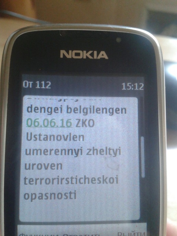 В Казахстане введен желтый уровень террористической опасности. Тревожное известие пришло жителям Западно-Казахстанской, Карагандинской, Алматинской, Павлодарской, Мангистауской, Кызылординской, Жамбылской и других областей, а также Астаны и Алматы, сообщает корреспондент Tengrinews.kz. В начале четвертого вечера казахстанцы стали получать SMS с сообщением о том, что в области введен умеренный – "желтый" уровень террористической опасности.