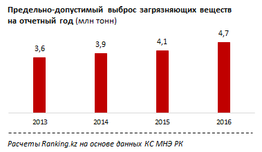На 2016 год государство установило лимит выбросов загрязняющих веществ на уровне 4,7 миллиона тонн. Предельные нормы загрязнения увеличились сразу на 13,6 процента по сравнению с уровнем на 2015 год.