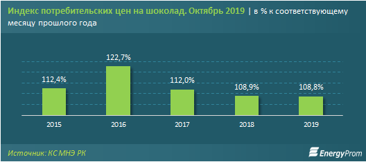 Цены на шоколад в Казахстане выросли за год на девять процентов. Годом ранее рост был примерно таким же: плюс 8,9 процента. За последние годы пик роста цен на шоколад в соответствующем месяце наблюдался в 2016 году, когда по итогам октября годовое удорожание шоколада почти достигло 23 процентов.