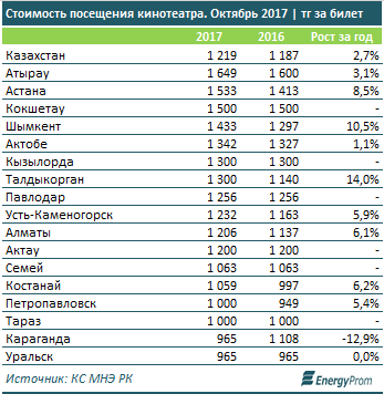 Билеты в кино по итогам октября стоили в среднем по РК 1 219 тенге за сеанс - на 2,7 процента больше, чем годом ранее. Больше всего в крупных городах и мегаполисах страны платить приходится киноманам Атырау и Астаны.