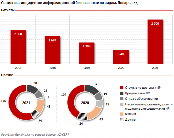 Инцидентов, при которых фиксировалось отсутствие доступа к интернет-ресурсам, было зафиксировано 176 - на 69,2 процента больше, чем годом ранее. Количество кибератак, связанных с кражей персональных данных казахстанцев, то есть случаев фишинга, осталось без изменений: 43 инцидента. Число инцидентов, связанных с вредоносным ПО, за год выросло с 37 до 38.