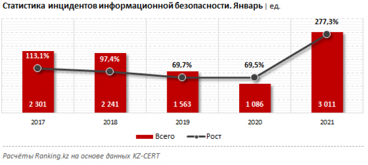 В январе 2021 года в Казахстане было совершено чуть более трех тысяч кибератак - в 2,8 раза больше по сравнению с январем прошлого года. При этом годом ранее количество кибератак показывало спад на 30,5 процента, передает Tengrinews.kz со ссылкой на Ranking.kz.