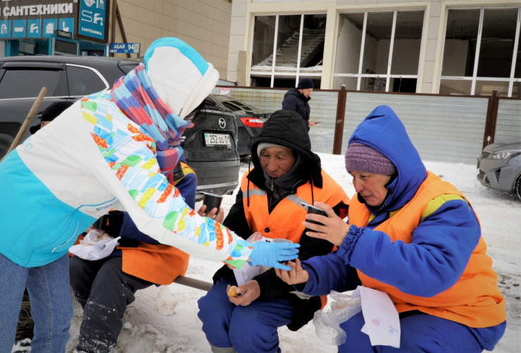 "Мы раздаем горячий чай и баурсаки с желанием помочь сотрудникам, задействованным в уборке города от снега. Мероприятие проходит в рамках "Марафона добрых дел", - сообщил руководитель отдела управления по вопросам молодежной политики города Акулан Тастемир.