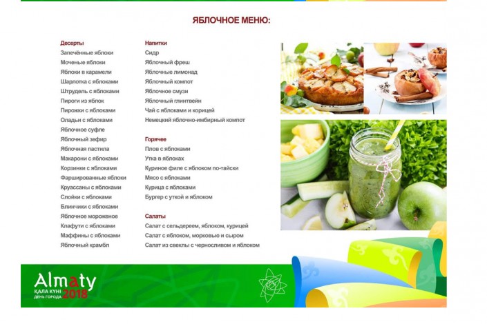 В честь Дня города акимат Алматы объявил конкурс среди ресторанов и кафе на создание лучшего яблочного меню, передает  Tengrinews.kz.