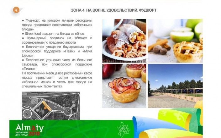"Мы приглашаем всех рестораторов создать новые блюда, десерты и напитки на основе яблок. Участвуйте в общегородском конкурсе, и ваша кулинарная фантазия и мастерство обязательно принесут вам победу. Вы получите не только приз от организаторов, но и уникальную возможность представить ваш ресторан, бар или кафе на масштабном праздновании Дня города 14-16 сентября 2018 года. Алматы - родина яблок. Так почему в кафе и ресторанах нашего города мало блюд на их основе? Вместе мы сделаем Алматы столицей яблочных рецептов", - прокомментировали в управлении культуры и архивов города.