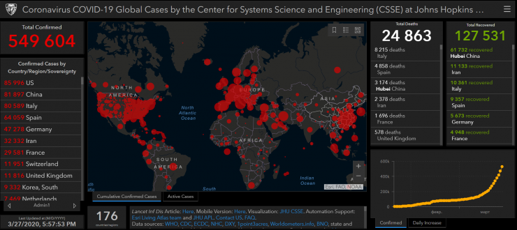 В мире число заражений превышает 549 тысяч человек. США вышли на первое место в мире по количеству случаев коронавируса, за один день обойдя Китай и Италию, сейчас там почти 86 тысяч зараженных. Зато в Китае количество инфицированных почти не растет - по прежнему 81,7 тысячи случаев.