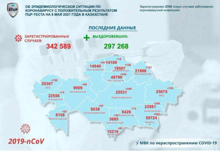 За прошедшие сутки (по данным на 8 мая) в Казахстане зарегистрировано 2350 новых случаев заболевания коронавирусной инфекцией, передает Tengrinews.kz со ссылкой на МВК по нераспространению COVID-19.
