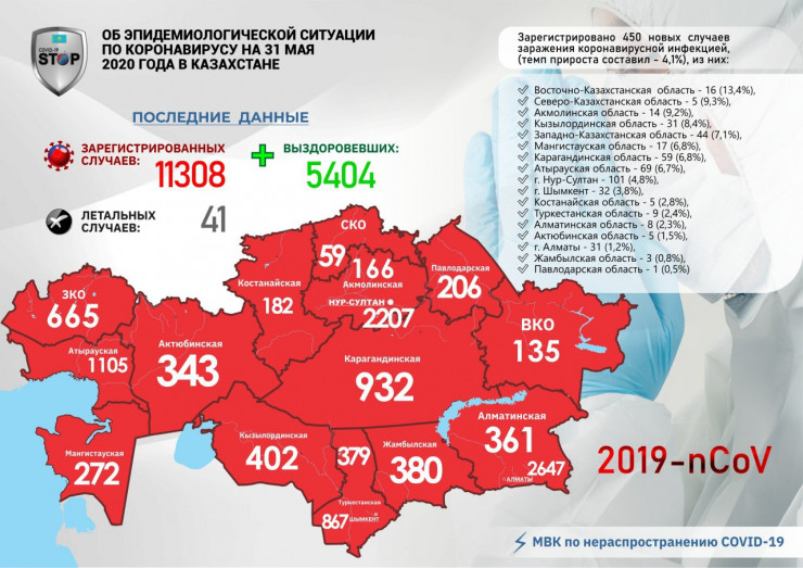 В Казахстане за прошедшие сутки (31 мая) выявлено 450 новых случаев коронавирусной инфекции, передает Tengrinews.kz со ссылкой на coronavirus2020.kz.
