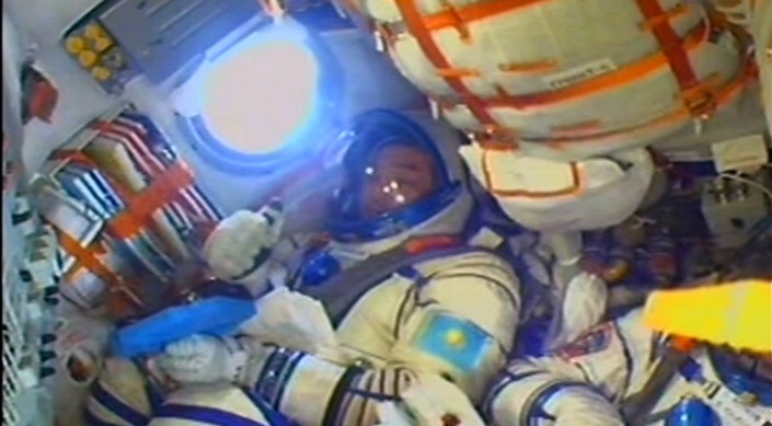 Айдын Аимбетов во время полета к МКС. Кадр из трансляции "Роскосмоса"