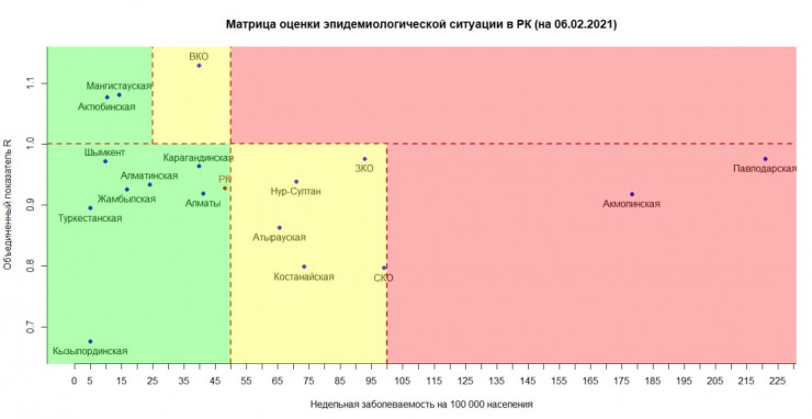 По матрице оценки эпидемиологической ситуации в регионах Казахстана на 6 февраля, в "красной" зоне остались лишь Акмолинская и Павлодарская области. В "желтой" зоне находятся Нур-Султан, Атырауская, Восточно-Казахстанская, Западно-Казахстанская, Костанайская и Северо-Казахстанская области. В "зеленой" зоне - все остальные регионы.