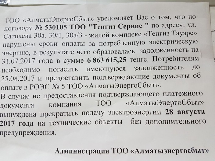 "Вчера полдня не было воды. Отключили насосы, которые подают холодную воду, из-за долга управляющей комплексом компании Tengiz service перед "АлматыЭнергоСбытом". Без воды и в неопределенной ситуации остаются более 300 квартир и пять башен в центре города. В том же комплексе находятся 100 офисов, в частности дочка Нацбанка, филиал Евразийского банка и много других предприятий. Сегодня повесили объявления, что с понедельника отключат электричество", - рассказал житель ЖК.