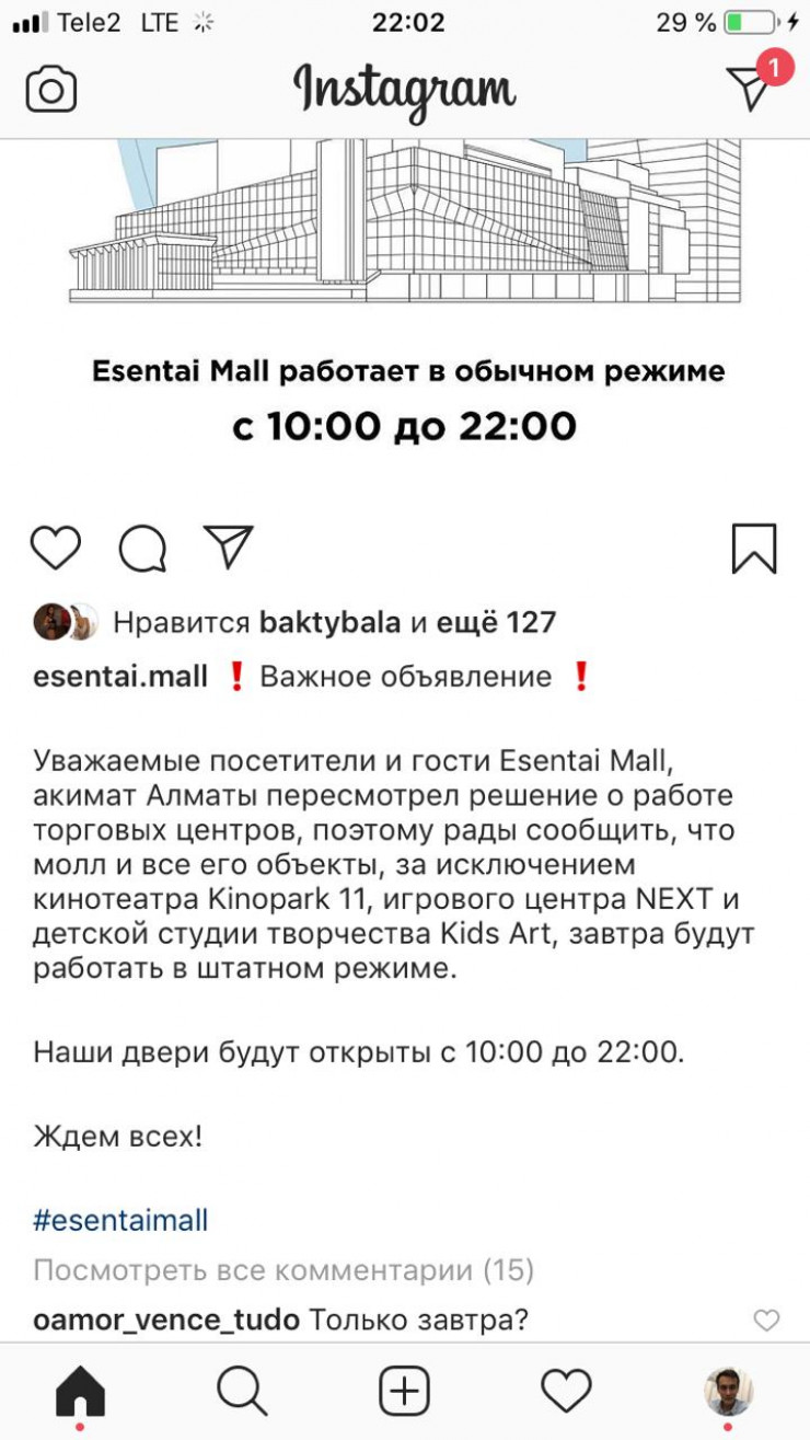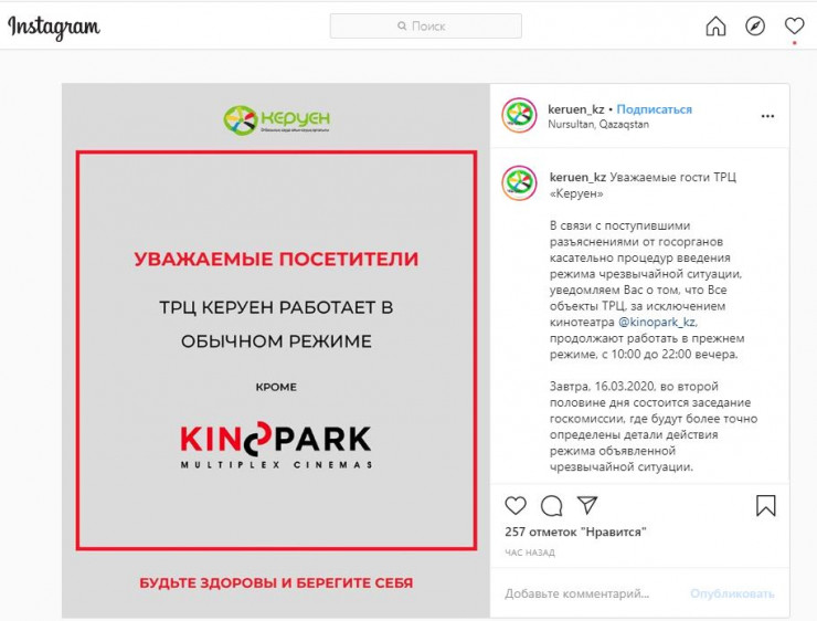 Сеть торгово-развлекательных центров Mega, ТРЦ Esentai Mall и ТРЦ "Керуен" сообщили, что 16 марта будут работать в соответствии со своим привычным графиком, передает Tengrinews.kz.