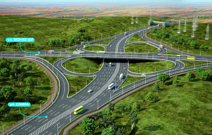 Развязка будет в форме бабочки: улица Саина на перекрестке уйдет под улицу Монке би, тем самым обеспечив водителям непрерывное движение. Также авторы проекта построят рядом с развязкой надземные пешеходные переходы. Их форма и конструкция напоминают те, что на данный момент стоят возле барахолки по улице Северное кольцо.