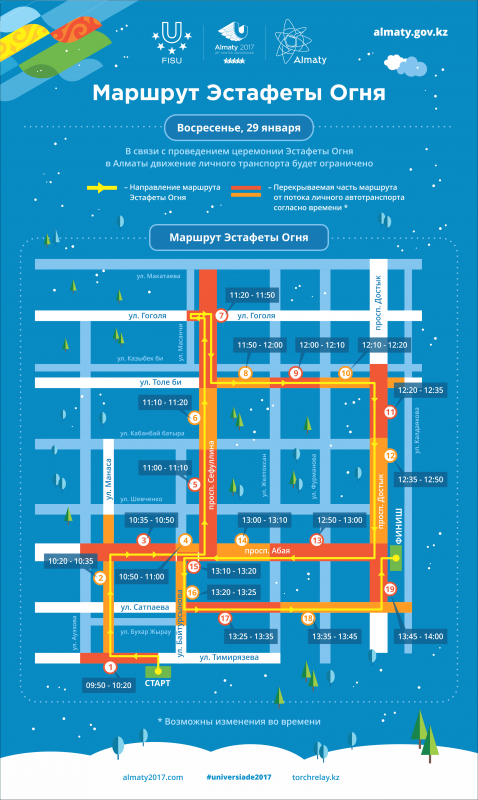 Далее факелоносцы отправятся в сторону проспекта Достык и оттуда донесут огонь Универсиады до Дворца Республики. Символ предстоящих игр также побывает на высокогорном катке "Медеу" и горнолыжном курорте "Шымбулак". Там факел будут нести призерка зимних Олимпийских игр Елена Хрусталева, альпинист Максут Жумаев и певец Али Окапов. А завершит эстафету боксер Назым Кызайбай.