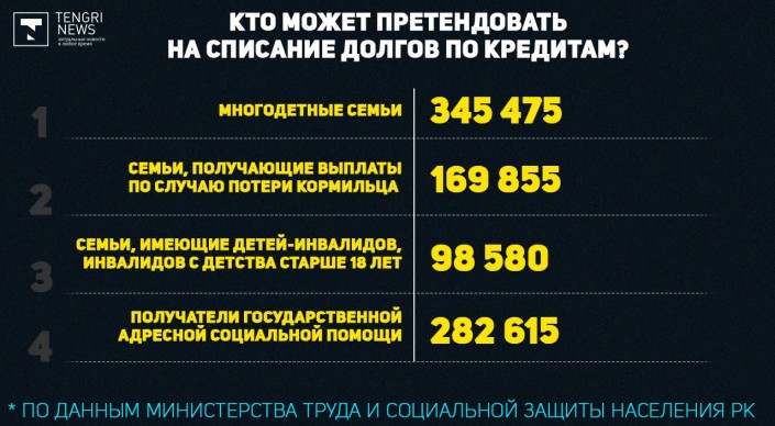 Акорда сообщала, что новым указом планируется охватить порядка 500 тысяч казахстанцев. Долги по кредитам, согласно документу, предполагается списать многодетным семьям, семьям, получающим выплаты по случаю потери кормильца, семьям, имеющим детей-инвалидов, инвалидов с детства старше 18 лет, получателям государственной адресной социальной помощи и детям-сиротам.