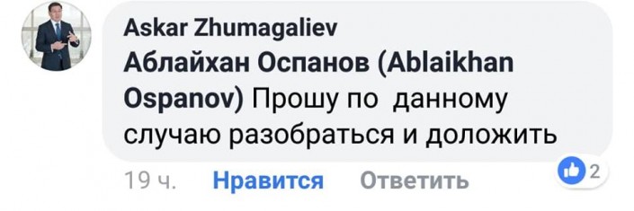 Возможно, ситуация не разрешилась бы, если бы инцидент не заметил вице-премьер Аскар Жумагалиев. В комментариях под постом он поручил разобраться главе госкорпорации "Правительство для граждан".