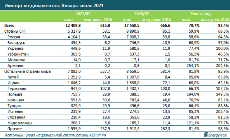 За полгода в страну завезли 12,4 тысячи тонн медикаментов на сумму 615,8 миллиона долларов. На страны СНГ пришлось 5,3 тысячи тонн, что на 59,9 процента больше, чем годом ранее. Здесь основным поставщиком с начала года стала Россия.
