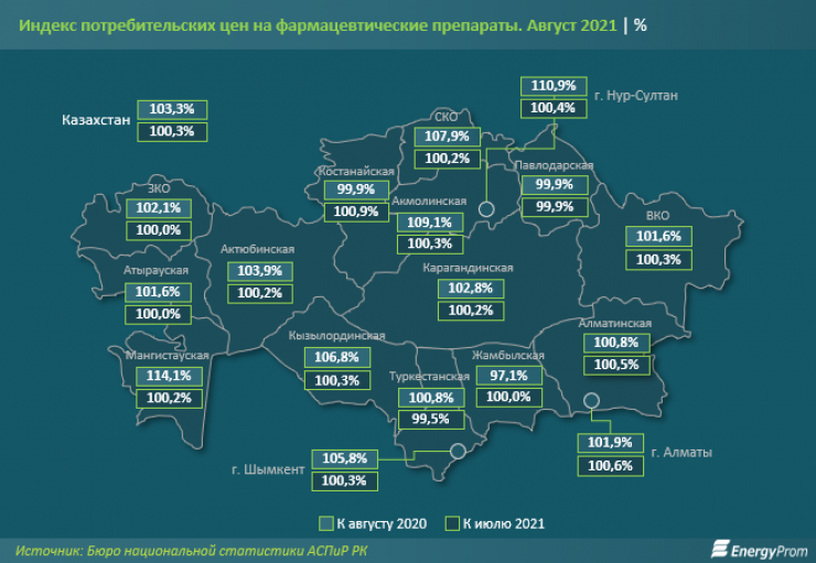 Сильнее всего цены на препараты в годовой динамике выросли в Мангистауской области - на 14,1 процента. Значительно подорожали лекарства также в Нур-Султане - на 10,9 процента и в Акмолинской области - на 9,1 процента.