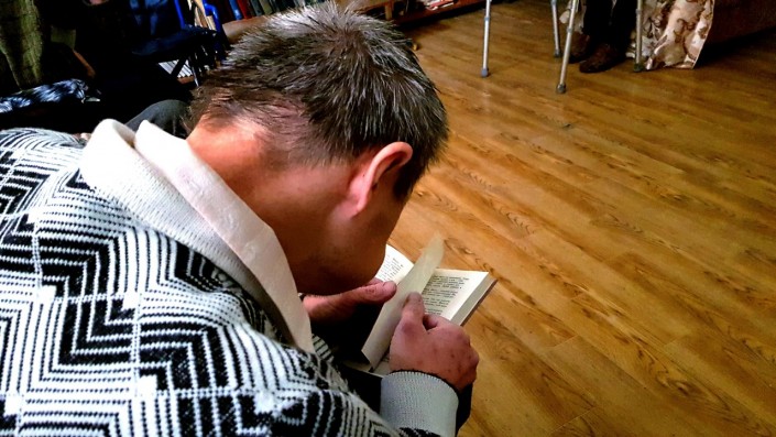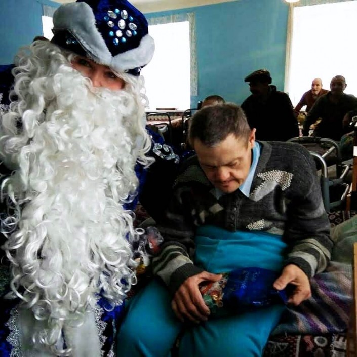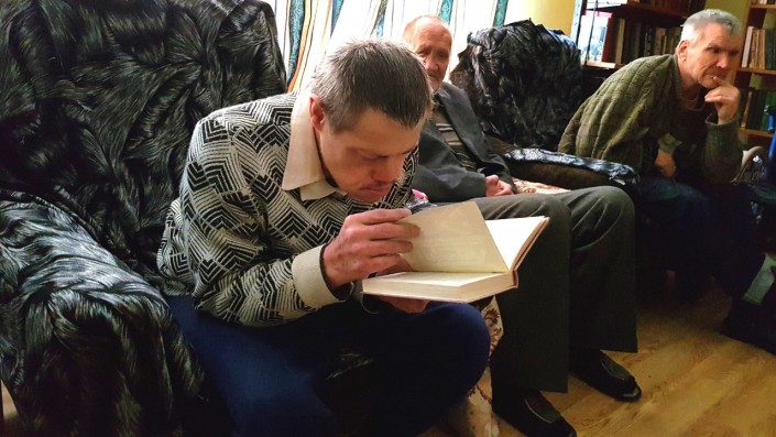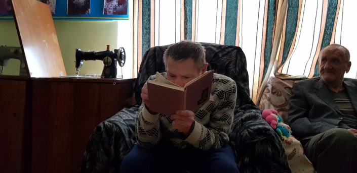 В нем Виталий живет больше полугода. Сначала он был немного напуган, но быстро привык к здешним правилам и людям. Видно, что жизнью большой ребенок доволен: у него есть любимые игрушки, а на Новый год подарок ему принес сам Дед Мороз. Тех, кто за ним ухаживает, Виталий называет мамами и папами. Читать он не умеет, зато блестяще подражает собравшимся в библиотеке: сосредоточенно смотрит в книгу, слюнявит палец, перелистывает страницы, бормочет что-то под нос и хмурит брови. А еще любит петь и танцевать: маленькие концерты с восторгом встречают и сотрудники, и жители центра.