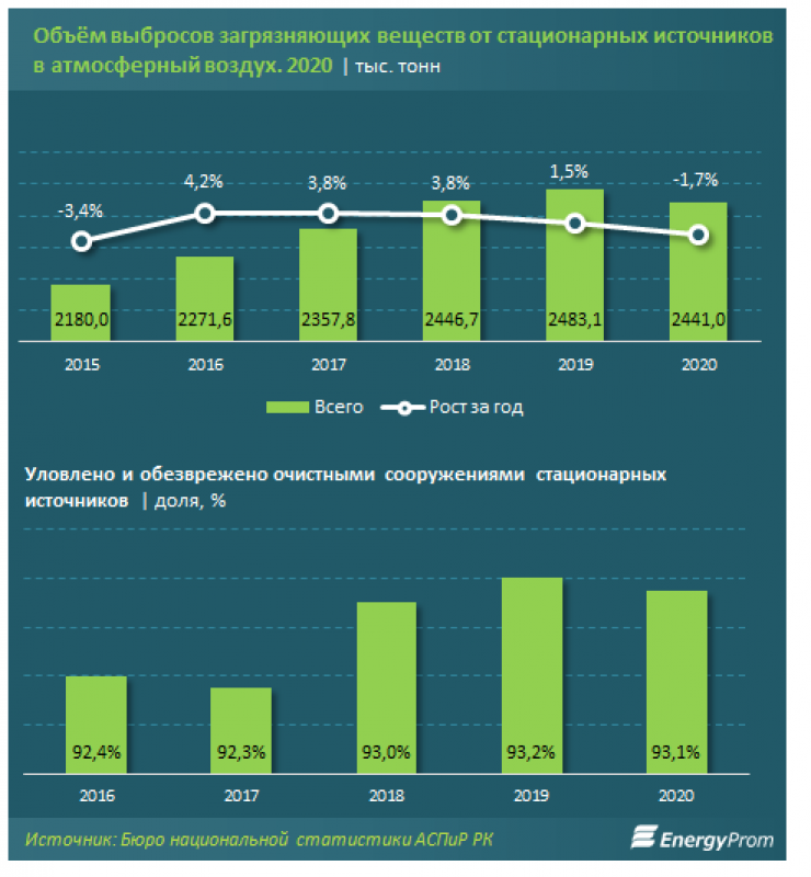 Объем выбросов загрязняющих веществ от стационарных источников в атмосферный воздух в Казахстане за 2020 год составил более 2,4 миллиона тонн, что на 1,7 процента меньше, чем за 2019-й. Сокращение объема выбросов было отмечено впервые за последние 5 лет, ранее в 2015 году показатель сокращался на 3,4 процента.