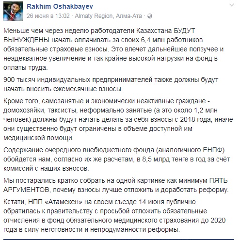 "Поэтому я начну выкладывать в виде отдельных постов тезисы моих АРГУМЕНТОВ ПРОТИВ ОСМС (#БиртановCare), почему по мнению нашего Центра "Талап" предложенная реформа нецелесообразна и приведет к негативным последствиям. (...)  В тоже время в послевкусии от дебатов, когда эмоции уже остыли, появилось место и определенному разочарованию. Во время дебатов мне стало окончательно ясно, что из инициаторов реформы мало кто толком вникал в обоснование реформы, не проверял эту псевдоактуарную расчетную модель, в которой есть ошибки, не обсуждал с казахстанскими экспертами и НПП последствия реформы, очевидные негативные экономические эффекты. Я был искренне удивлен столь поверхностным подходом. Финальной аргументацией на всю критику всегда звучат ссылки на якобы международный опыт что, кстати, оказалось неправдой - мы, подняли ключевые документы ВОЗ по переходу на страховую медицину, там диаметрально противоположные выводы. Мы их скоро опубликуем", - написал в Facebook экономист