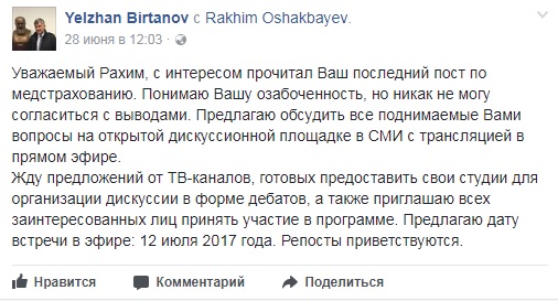 Напомним, министр здравоохранения РК предложил экономисту такой формат дискуссии после поста экономиста в Facebook, где последний раскритиковал систему обязательного медицинского страхования.