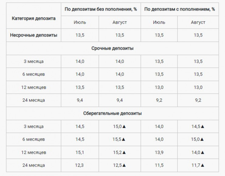 По сберегательным депозитам на 3 и 6 месяцев ставки выросли на 0,5 процентного пункта и 1,0 процентного пункта соответственно, по сберегательным депозитам на 12 месяцев - на 0,1 процентного пункта и на 24 месяца - 0,2 процентного пункта.