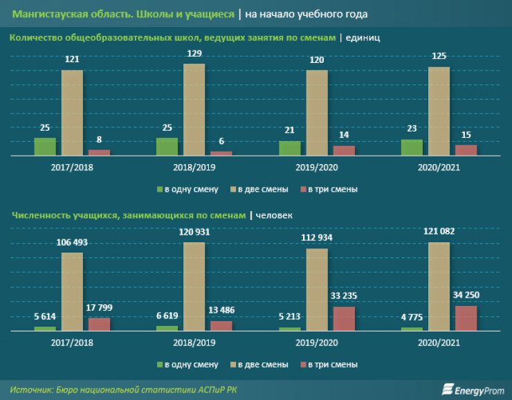 На сегодня Мангистауская области обгоняет три региона страны по населению, но при этом сразу шесть областей по числу детей и подростков старше 15 лет. По численности родившихся область заняла 10-е место в стране. В регионе уже сейчас наблюдается нехватка ученических мест. На начало 2020 учебного года в области работали 15 трехсменных школ, или 9,2 процента от всех школ региона. При этом в целом по РК трехсменные школы составляют всего 2,2 процента от общего количества. В таких школах обучалось 34,3 тысячи детей, или чуть больше 21 процента от общего числа учеников в регионе. В школах с одной сменой, которые соответствуют мировым стандартам образования, училось всего 3 процента школьников области.
