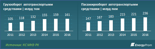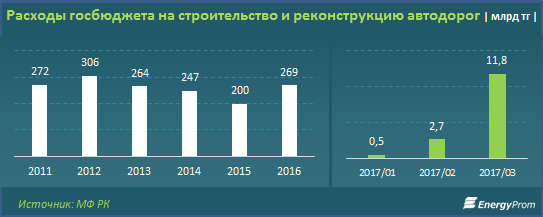 Как сообщается, за 2016 год расходы госбюджета на строительство и реконструкцию автодорог увеличились на 35 процентов, составив 269 миллиардов тенге против 200 миллиардов тенге годом ранее.