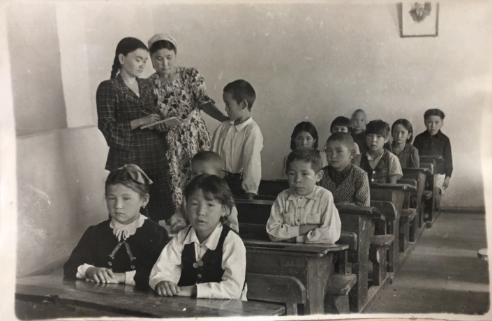 Школа в колхозе Алгабас, урок русского языка в местной школе. 1939 год.