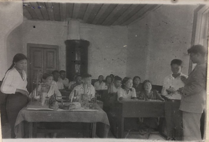 Село Байсерке, 1939 год, урок физики в 8 классе. По большей части на учениках привычный нам "белый верх, черный низ". На девушках - блузы и юбки, парни - в рубашках и брюках. Внимание привлекает расположенная у дальней стены железная печь. По всей видимости, в те времена классы отапливались по отдельности.