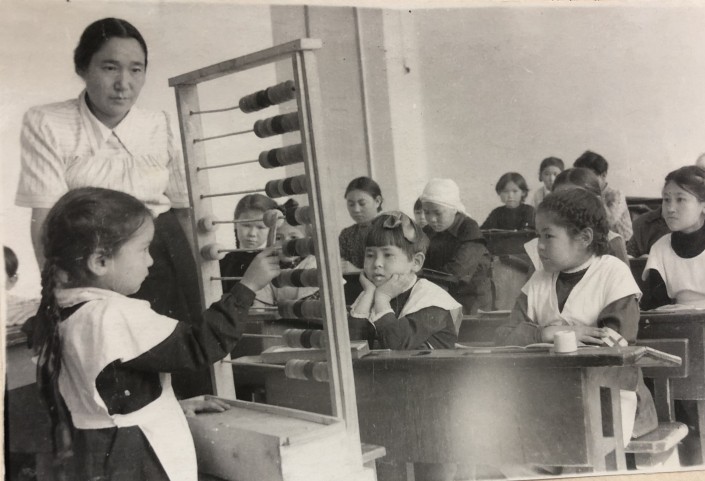 Урок арифметики в казахской средней школе № 12 города Алма-Аты. Сложению и вычитанию учеников учат на больших счетах. Тех самых, где есть "косточки" - единицы, десятки и сотни. Все школьницы в форменных платьях и фартуках.