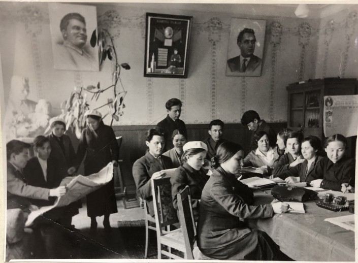 1937 год. Учительская школы № 12 города Алма-Аты. В те годы в моде были белые береты. Три из 10 находящихся в помещении учительниц следуют тренду.