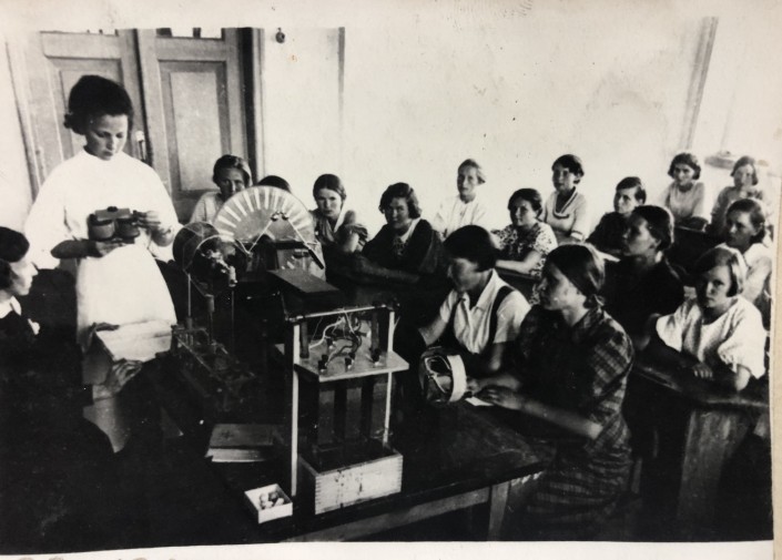 1938 год. Урок физики в старшем классе. 10-классники одеты уже в более разнообразную и похоже, что модную, одежду. Единой формы так и нет. Но заметно, что поход в школу - значимое событие. Девушки, по всей видимости, надевают на занятия свои лучшие наряды. На одной - белое платье с высоким воротником, на второй - в крупную клетку, на третьей - сарафан и блуза. Рукава одного фасона - пышные и до локтя.