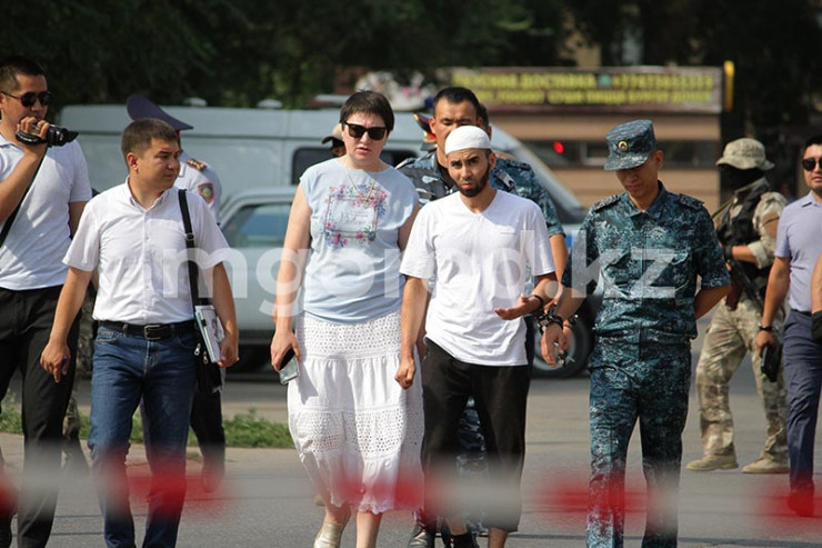 Далее Кожантаева в сопровождении вооруженных силовиков повели по улице Исатая-Махамбета вдоль частных домов. Предположительно, он показывал, как убегал после совершения преступления. При этом подозреваемый выглядел спокойно, говорил тихо и выполнял все приказы сотрудников полиции.