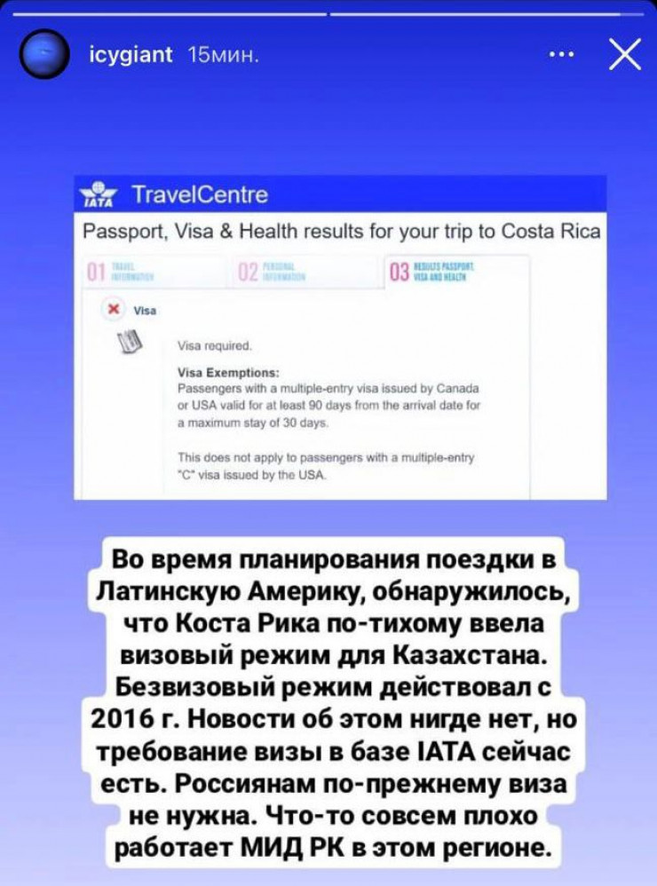 "Во время планирования поездки в Латинскую Америку, обнаружилось, что Коста-Рика по-тихому ввела визовый режим для Казахстана. безвизовый режим действовал с 2016 года. Новости об этом нигде нет, но требование визы в базе IATA (Международная ассоциация воздушного транспорта) сейчас есть. Россиянам по-прежнему виза не нужна. Что-то совсем плохо работает МИД Казахстана в этом районе", - написал финансовый эксперт Icygiant.