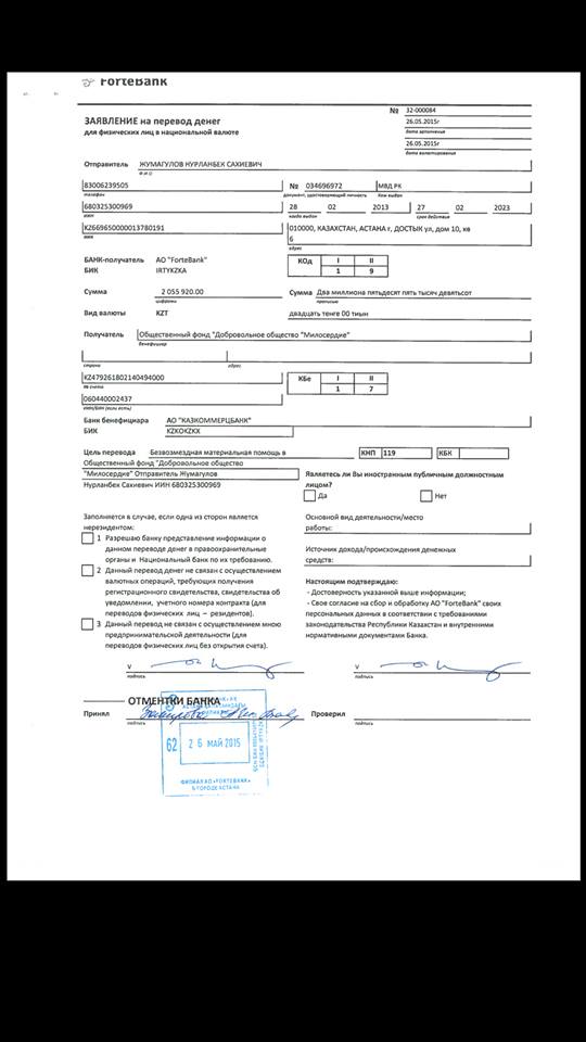 Накануне адвокат Алиби Жумагулова Хамида Айткалиева разместила в социальной сети Facebook изображения документов о перечислении средств в фонд помощи детям. "Выложила документы, подтверждающие перечисление собранных для Алиби денег в Фонд Аружан Саин. Любой из вас может проверить, куда будут израсходованы деньги, обратившись в банк", - написала в Facebook адвокат.