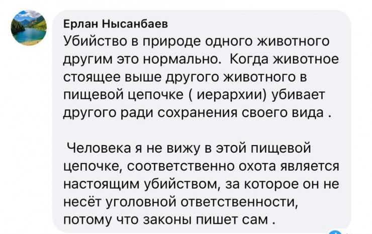 "Убийство животного животным в природе - это нормально. Когда животное, стоящее выше другого животного в пищевой цепочке, убивает другого ради сохранения вида. Человека я не вижу в этой пищевой цепочке, соответственно, охота является настоящим убийством, за которое он не несет уголовной ответственности, потому что законы пишет сам", - написал вице-министр.