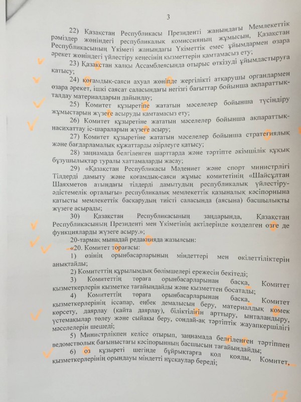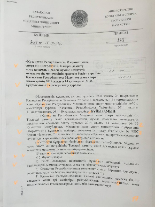 Отметим, что приказ с ошибками министра культуры и спорта РК "О внесении изменений в приказ министра культуры и спорта Республики Казахстан от 14 октября 2014 года №36 "Об утверждении Положения государственного учреждения "Комитет по развитию языков и общественно-политической работы Министерства культуры и спорта Республики Казахстан" от 18 мая 2015 года на казахском языке был официально опубликован 28 июля 2015 года. На четырех страницах документа пользователи Казнета насчитали около 50 орфографических ошибок и опечаток.