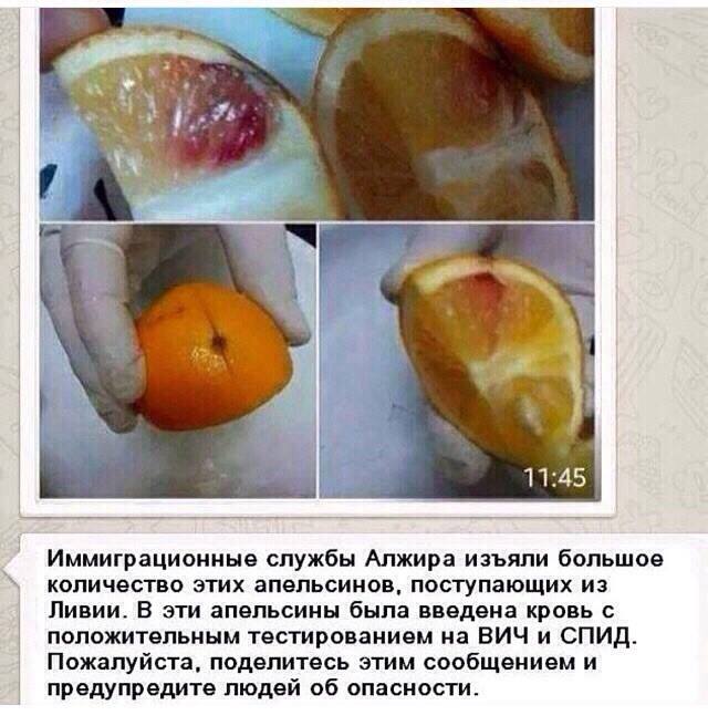 Отметим, казахстанцы стали получать по WhatsApp фотографии с сообщениями, в которых говорится о том, что "иммиграционные службы Алжира изъяли партию апельсинов, которые могут быть напичканы кровью больных людей". Подобные предупреждения стали публиковаться уже и в социальной сети, в частности, в Facebook.