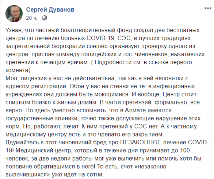 Ранее в Facebook появились публикации о том, что благотворительный фонд создал два бесплатных центра по лечению больных коронавирусом. В один из них пришли с проверкой, а также выразили претензии к врачам.