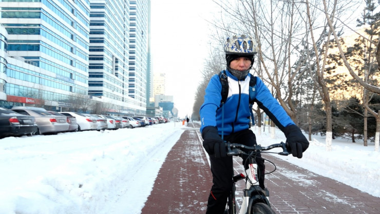 В Алматы климатические условия для любителей велотранспорта относительно мягкие даже в зимнее время, однако в Нур-Султане температура может опускаться ниже -30 градусов. Это не останавливает таких энтузиастов, как участника группы "ВелоТоп Астана" Баглана Игликова. Баглан уже три зимы добирается на работу на велосипеде.