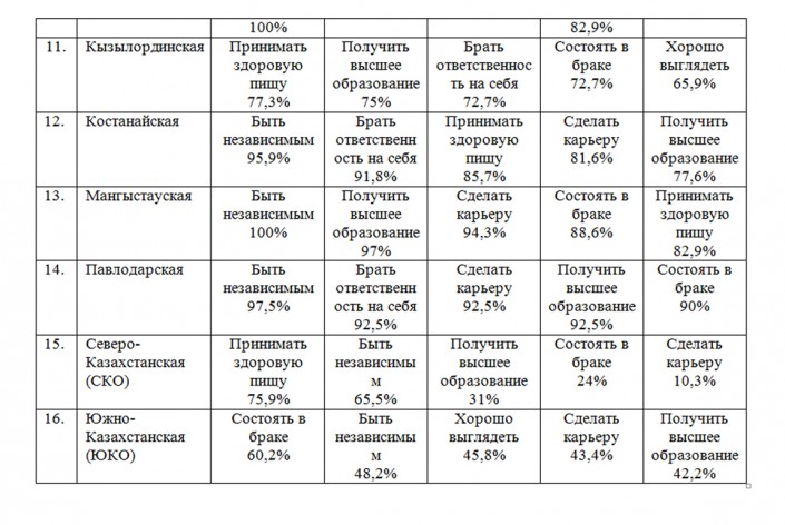 Для сельской молодежи важно быть преданным - 90,5 процента, употреблять здоровую пищу - 82,1 процента, иметь семью и брак - 80,3 процента. Среди регионов Алматинская область с цифрой в 98,2 процента лидирует по количеству молодежи, для которой важно состоять в браке. Карагандинская область стала лидером в вопросе здорового питания, Мангыстауская - по важности для молодых людей получить высшее образование и сделать карьеру. В Алматинской и Мангистауской области 100 процентов респондентов заявили о важности быть независимым. Также в Алматинской и Атырауской областях 100 процентов опрошенных считают важным брать ответственность на себя.