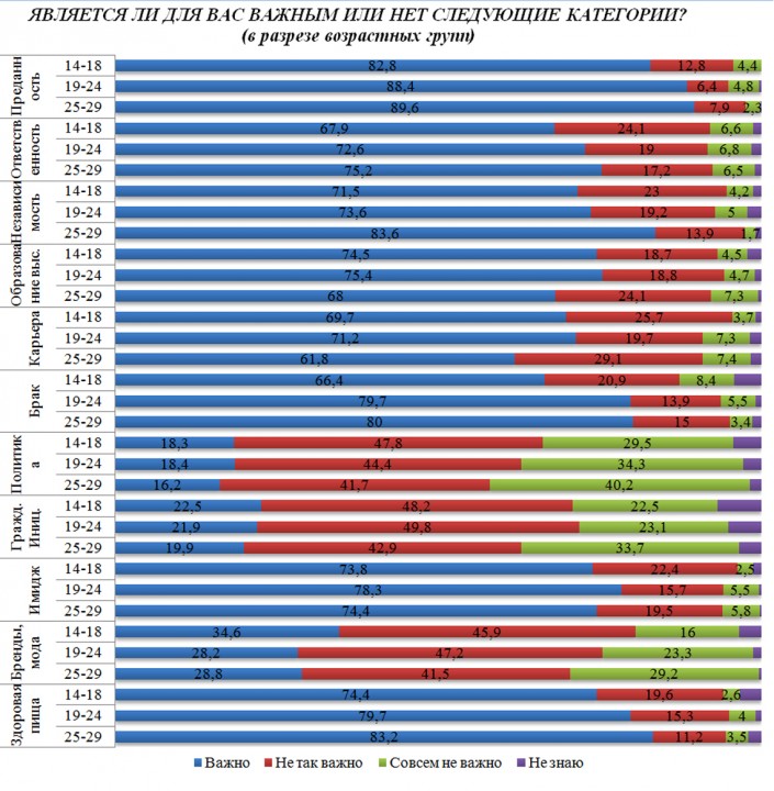Также отмечено, что молодое поколение ориентировано на успех. При этом, уровень удовлетворенности своим положением, своими планами и своими достижениями на сегодняшний день достаточно высок. Большая часть молодых людей склоняется к тому, что для успеха в жизни они должны определиться с желаниями, иметь в окружении надежных людей, ставить цели, и соблюдать моральные ценности общества.
