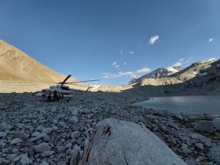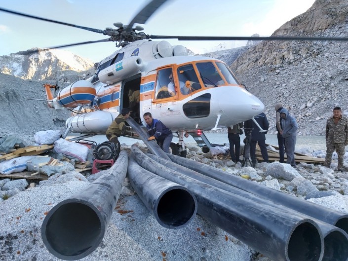 На вертолете МИ-171 на высоту была заброшена рабочая бригада из числа сотрудников ДЧС и Жетысу-Алатауского эксплуатационного управления "Казселезащиты". Им предоставили снаряжение, оборудование, строительные инструменты и материалы. Они опорожнили прорывоопасное моренное озера до безопасного уровня.
