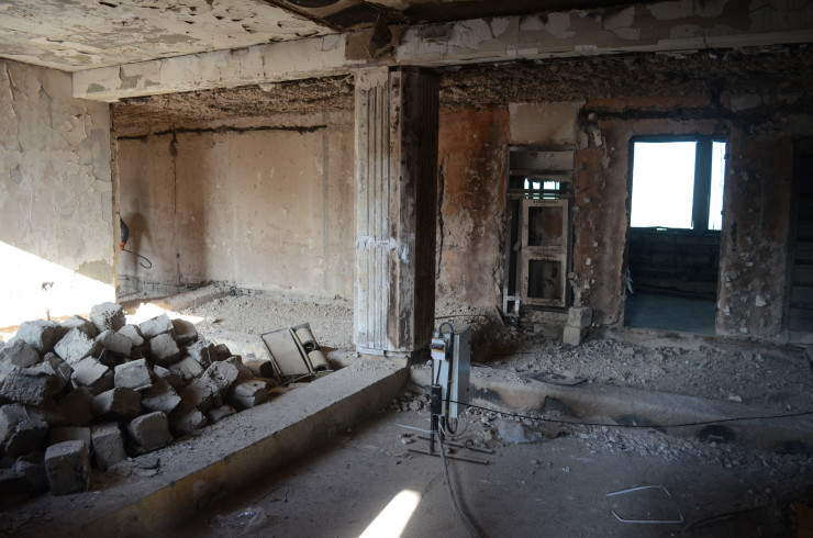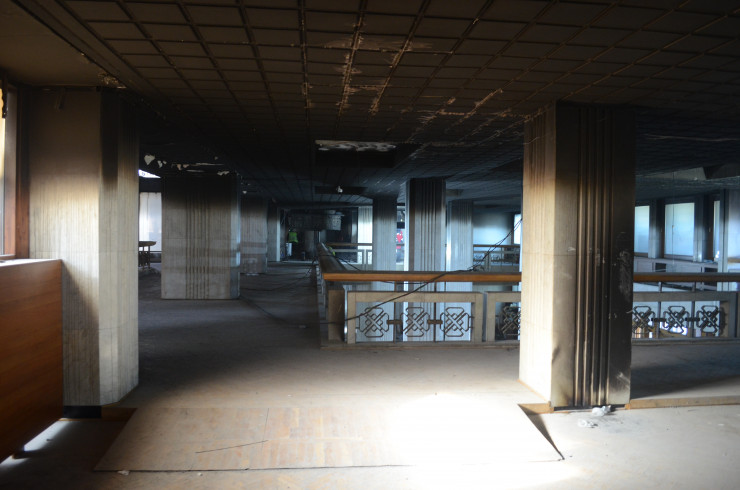 Внутри здания после пожара хорошо сохранились только вестибюль и лестницы. Кабинеты полностью выгорели вместе с паркетными полами, обшивкой стен и потолков. Сейчас их зачистили до бетона.