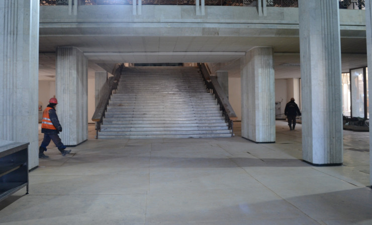 Курирующий работы по реконструкции здания заместитель акима Алматы Мухит Азирбаев отметил, что изначально они хотели максимально сохранить элементы здания и восстановить только серьезно пострадавшие участки. Часть мрамора, покрывающего фасад, пытались отмыть различной химией, и частично это даже удалось, однако предварительные результаты технического аудита показали, что, по-видимому, конструкцию всего фасада придется менять.