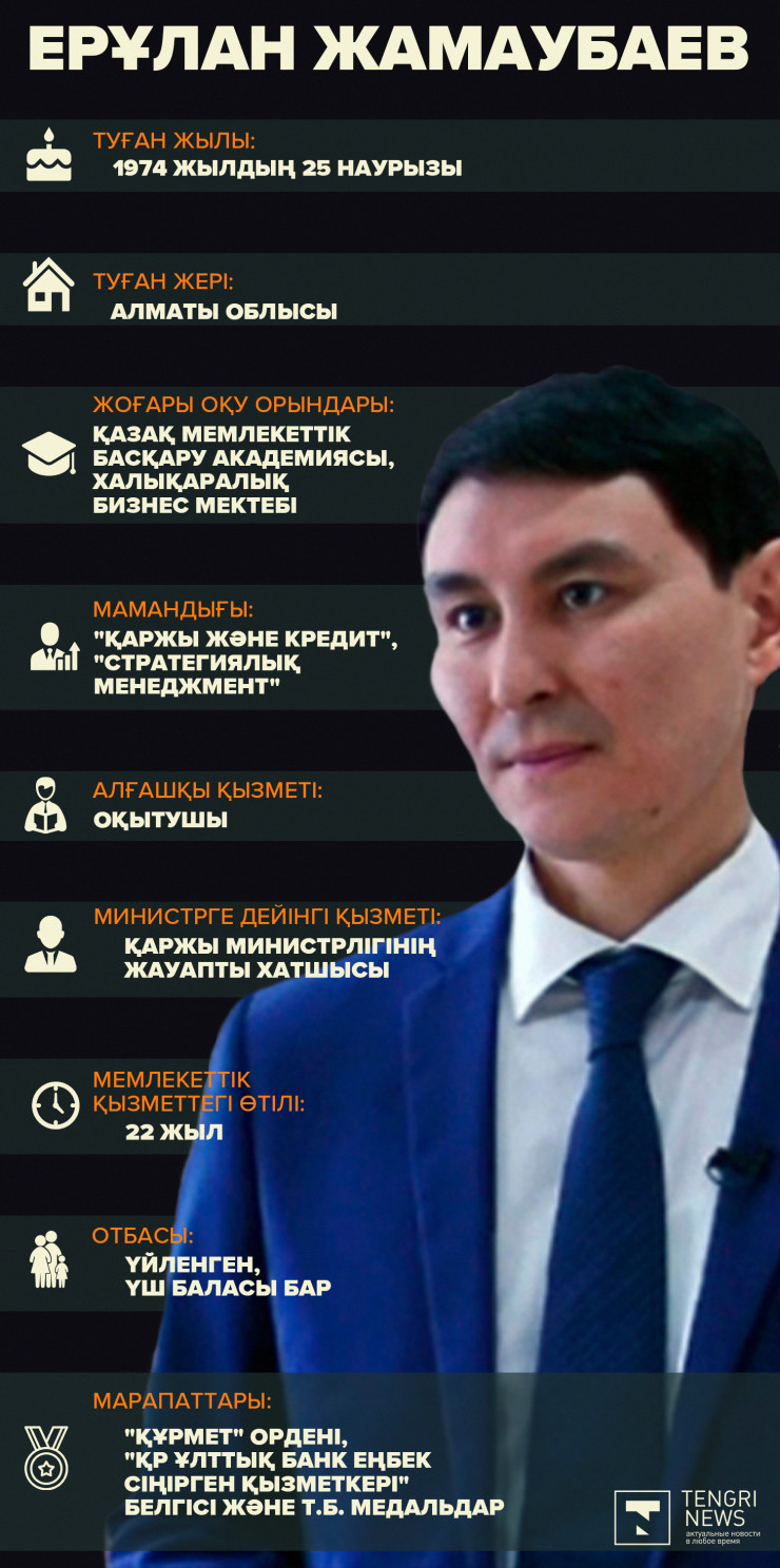Кеше Ерұлан Жамаубаев қаржы министрі болып тағайындалған еді. Ол бұл қызметте Әлихан Смайыловты алмастырған. Жамаубаев еңбек жолында министр қызметіне алғаш тағайындалып отыр. Tengrinews.kz тілшісі жаңа қаржы министрінің өмірі мен еңбек жолы туралы деректер жинады.