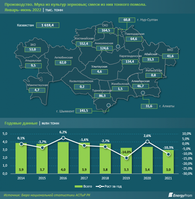 За январь - июнь 2022 года в стране произвели 1,6 миллиона тонн муки из зерновых культур - на 1,5 процента больше, чем годом ранее.