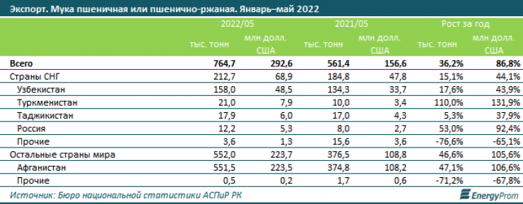 В страны СНГ было отправлено 212,7 тысячи тонн муки - на 15,1 процента больше, чем годом ранее. Больше всего казахстанской муки отправили в Узбекистан: 158 тысячи тонн - на 17,6 процента больше, чем за январь –  май 2021-го. В тройку лидеров также попали Туркменистан и Таджикистан.